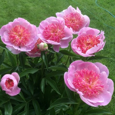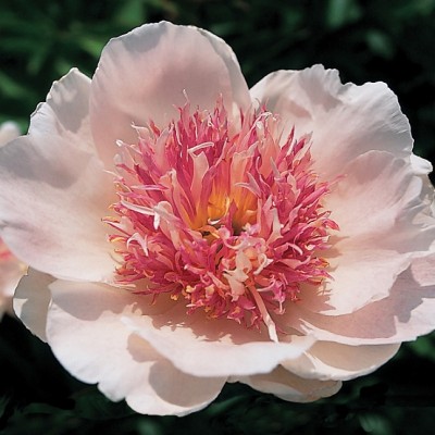 Узкие внутренние лепестки разного цвета: белого, розового, красного и пурпурного красиво контрастируют на фоне крупных внешних лепестков нежного перламутрово-розового оттенка. Куст красивой формы, с боковыми бутонами, темно-зелеными листьями. Золотая медаль Американского общества пионов!