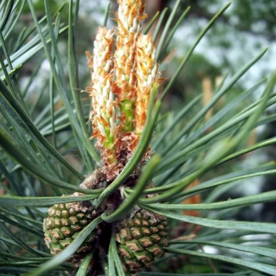 Хвоя: игольчатая, жесткая, в пучке по 2 шт, слегка изогнутая, сизовато-зеленая, шишки светло-коричневые, 3-4 см длиной.