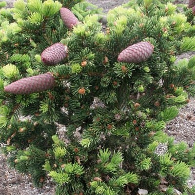 Хвоя: игольчатая, жесткая, колючая, зеленая, блестящая. Молодые приросты салатового цвета. Шишки крупные, лилово-красные, при созревании – коричневые, долго сохраняются на дереве.