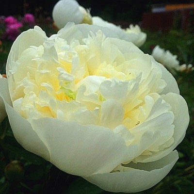 Крупные махровые цветы (диаметр до 16-18 см) белого цвета с желтым оттенком и зеленоватым основанием, постепенно становятся жемчужно-белыми. Куст быстро разрастается, обильно цветет. Срезочный сорт.
