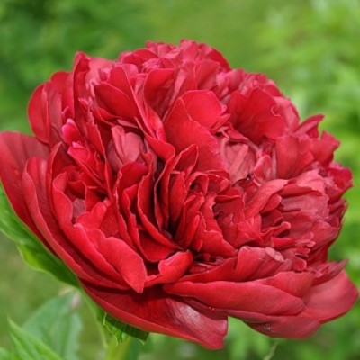 Огромные махровые цветы (диаметр до 22-25 см) с блестящими лепестками темно-красного цвета, внутренние лепестки образуют бутон в центре. Стебли крепкие.