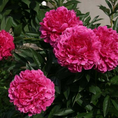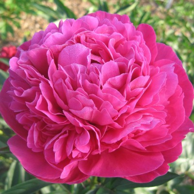 Крупные плотные махровые цветы (диаметр до 20 см) розовидной формы красного цвета с сиреневым оттенком. Обильноцветущий куст с прочными стеблями, листья темно-зеленые, крупные. Победитель международных выставок!