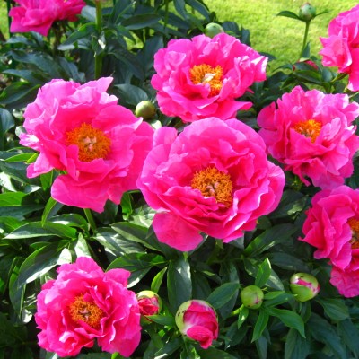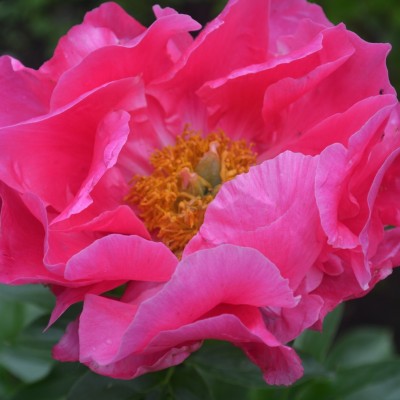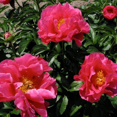 Крупные полумахровые цветы (диаметр 20 см) из плотных гофрированных лепестков потрясающего малиново-розового оттенка с неоновым переливом. В центре помпон из ярких желтых тычинок. Куст мощный, прямостоячий. Золотая медаль Американского общества пионов!