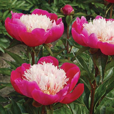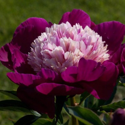 Помпон из белых стаминодий контрастирует с розово-красными крупными внешними лепестками (диаметр цветка 15 см.). Куст прямостоячий. Цветение очень обильное!