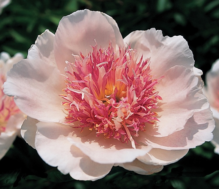Узкие внутренние лепестки разного цвета: белого, розового, красного и пурпурного красиво контрастируют на фоне крупных внешних лепестков нежного перламутрово-розового оттенка. Куст красивой формы, с боковыми бутонами, темно-зелеными листьями. Золотая медаль Американского общества пионов!