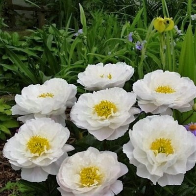 Очень крупные (диаметр 25 см) полумахровые белые цветы с желтыми тычинками в центре, в бутоне нежно-розовые. Цветение обильное. Стебли прочные.