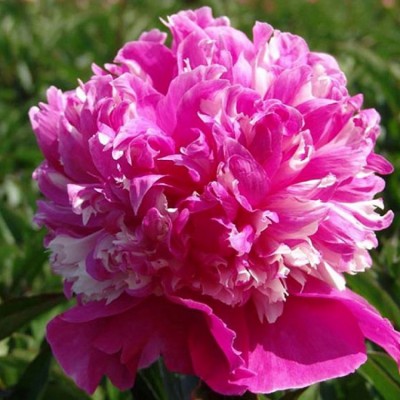 Махровый бомбовидный цветок (диаметр 15 см): внешние лепестки крупные малиново-фиолетовые, корона – чередующиеся лепестки белые и малиновые.