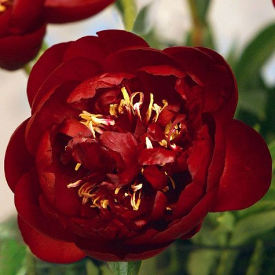 Полумахровый пион (диаметр 16 см) глянцевого темно-красно-коричневого цвета: наружные лепестки - крупные, внутренние – более мелкие, чередуются с желтыми тычинками.