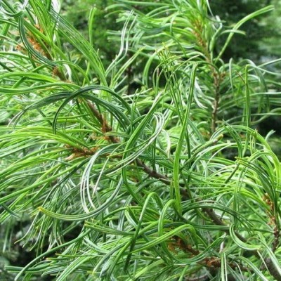 Хвоя: игольчатая, изогнутая, тонкая, длинная, голубовато-зеленая, собрана в пучки по 5 шт.