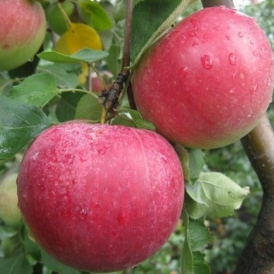 Плоды: среднего размера (140 гр.), приплюснутые. Кожица блестящая, зеленоватая. Покровная окраска на большей части поверхности плода в виде красного размытого румянца и крапин вишневого цвета.