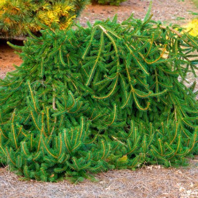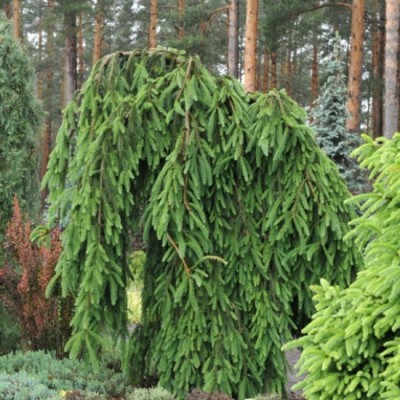 Форма: медленнорастущая ель с узкой «плакучей» формой кроны, свисающими вниз побегами. Внизу у земли образует небольшое расширение «юбку» за счет лежащих на земле побегов. Высота растения (10 лет) – 2,0 м.