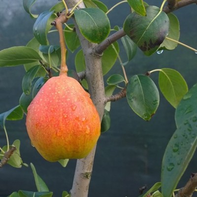Плоды: средней и крупной величины (130 - 250 гр.), слегка бугристые, по форме — широкогрушевидные. Основной окрас - желтый, покровная окраска - интенсивный темно-бордовый румянец.