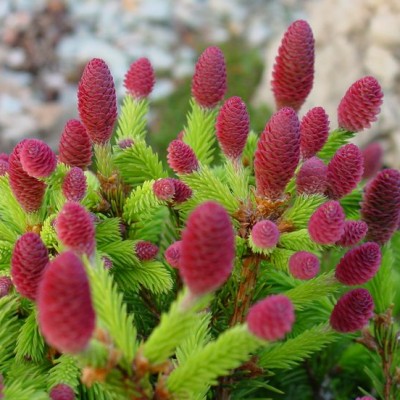 Форма: оригинальная карликовая форма с шаровидной кроной высотой и диаметром до 1,0 м. Особую декоративность весной придают многочисленные красные шишки на концах побегов.