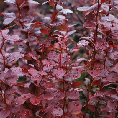 Листва: мелкая, красновато-фиолетовая, внутри кроны – зеленоватая, осенью – алая.