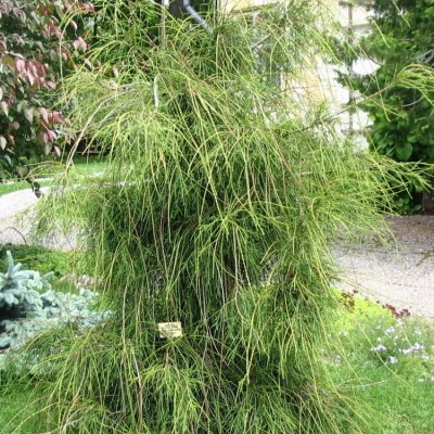 Форма: необычный многоствольный хвойный кустарник высотой до 2 м. шириной до 1,5 м. с нитевидными слаборазветвленными свисающими побегами длиной до 80 см.