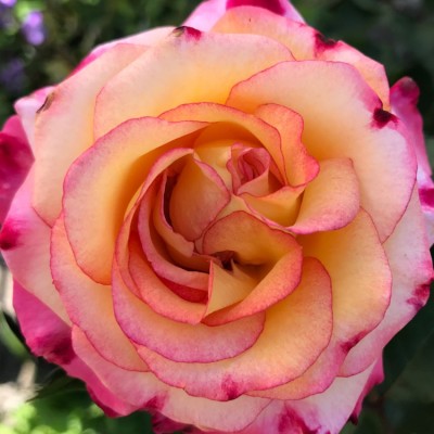 Бутоны заострённые. Цветки диаметром 10-11 см, махровые (40 лепестков), смешанных жёлтых оттенков с рубиново-красным на краешках лепестков, в основном одиночные. Аромат лёгкий, чайный. Цветоносы длинные. Цветение повторное. Кусты пряморослые, густые, высотой 150-170 см. Листва обильная, матовая, очень устойчивая к заболеваниям.