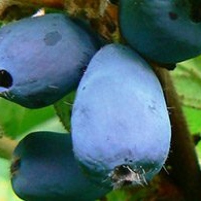 Плоды: среднего размера, булавовидной формы, немного вытянутые к основанию. Цвет ягод сине-голубой, присутствует сильный восковой налет.